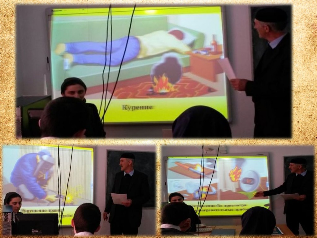 Открытый урок провёл учитель ОБЖ, Алиханов Мусхаб. На открытом уроке приняли участие учащиеся 10 и 11 классов. На уроке были использованы информационные технологии.