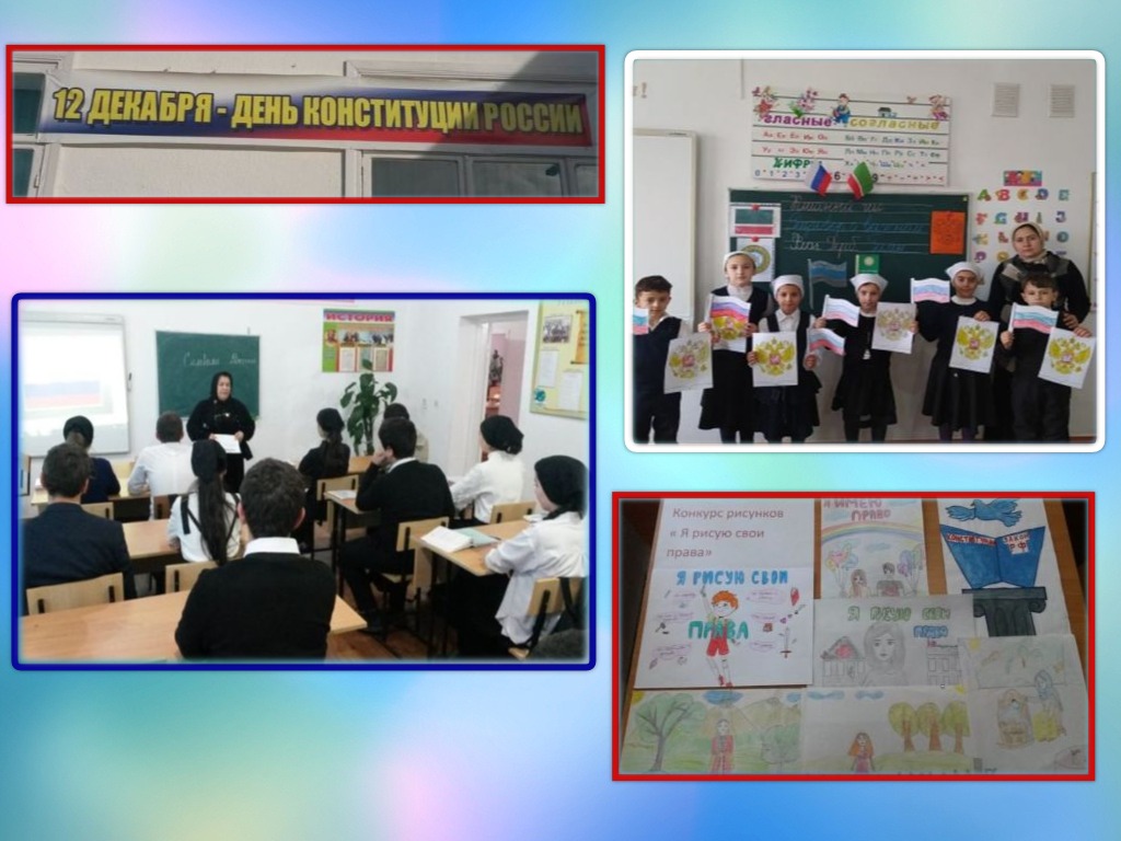 - с 5 декабря по 10 декабря 2022 года с учащимися Проведены классные часы и беседы на темы: "Герб, флаг, гимн России"(1-4 кл.); "Правовые и моральные последствия правонарушений"(5-7кл.); "Твои права и обязанности", «Основы Трудового законодательства» (8-11 кл.);