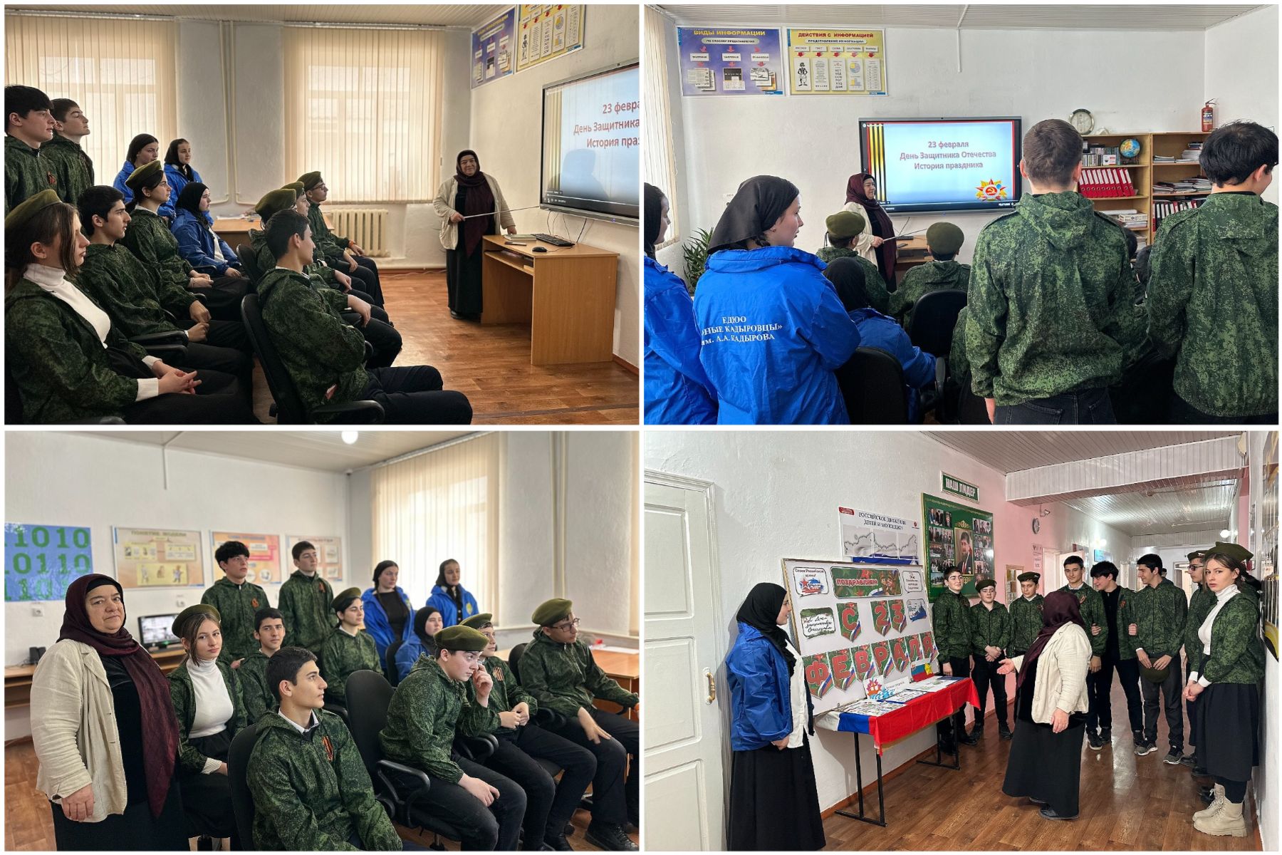 22.02.2024Учитель истории Ибрагимова Марьям Магомедовна совместно с представителем отдела в Ножай-Юртовском районе УФСБ России в Чеченской Республике 22 февраля 2024г провела классный час в 9 классе на тему «23 февраля – День защитника Отечества».