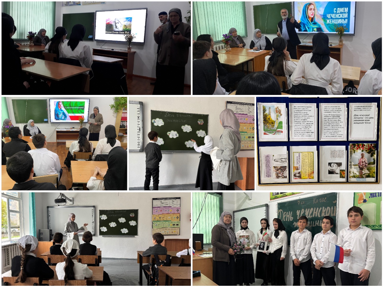 - с 8 сентября 2025 г. фасад здания школы оформлен баннером «С днём чеченской женщины»;